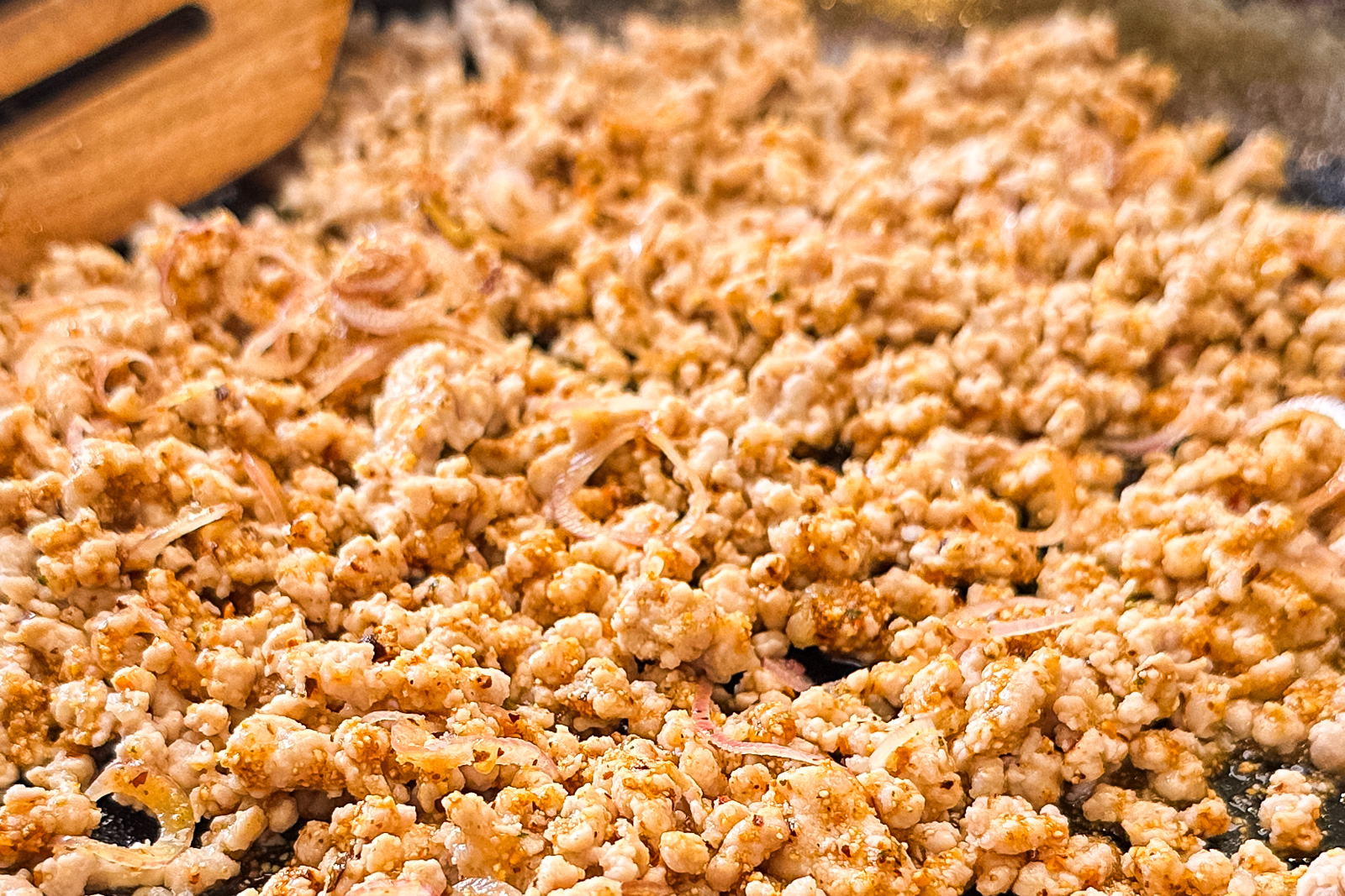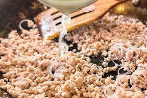 - Tilsett 3 ss sjalottløk i det varme kjøttet, rør godt.