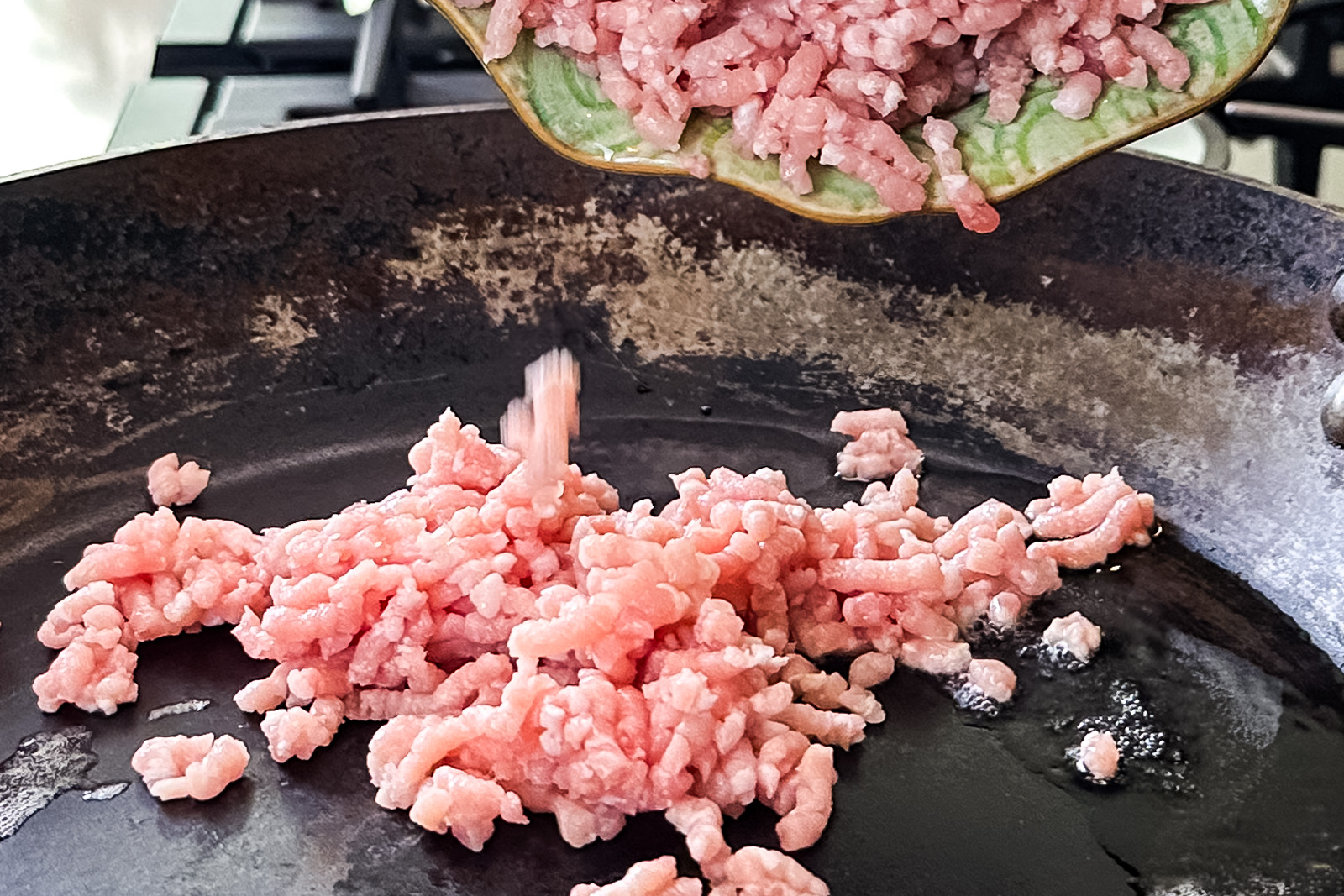 - Varm opp 2 ss vann i en panne på medium varme, tilsett 250 g svinekjøtt og stek det ved å røre hele tiden til det er gjennomstekt. Fjern fra varmen.