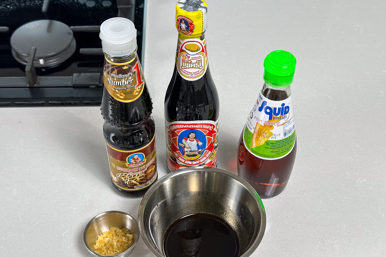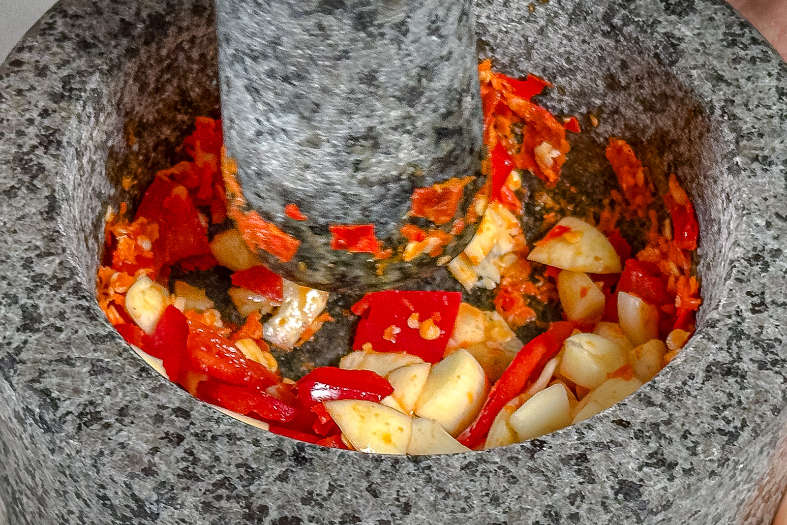 - I en morter knus 1-4 stk thai-chili etter ønsket styrke. Del 5 fedd hvitløk i to og knus dem sammen med chilien i morteren. Bland til slutt inn 60 ml mild rød chili delt i biter og slå det sammen med resten av blandingen. La det være litt biter i blandingen.