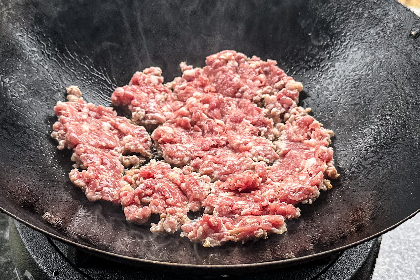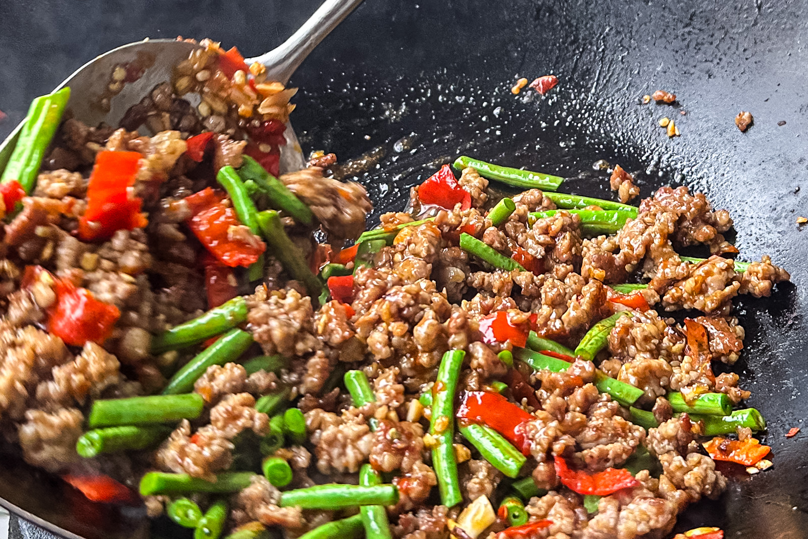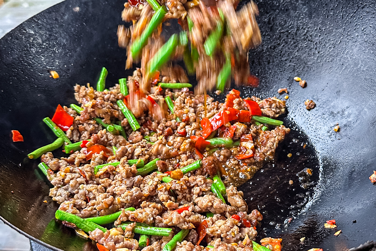 - Tilsett chili-og hvitløk pasten og wok i 1-2 minutter før du blander det inn med kjøttet og skrur opp varmen igjen