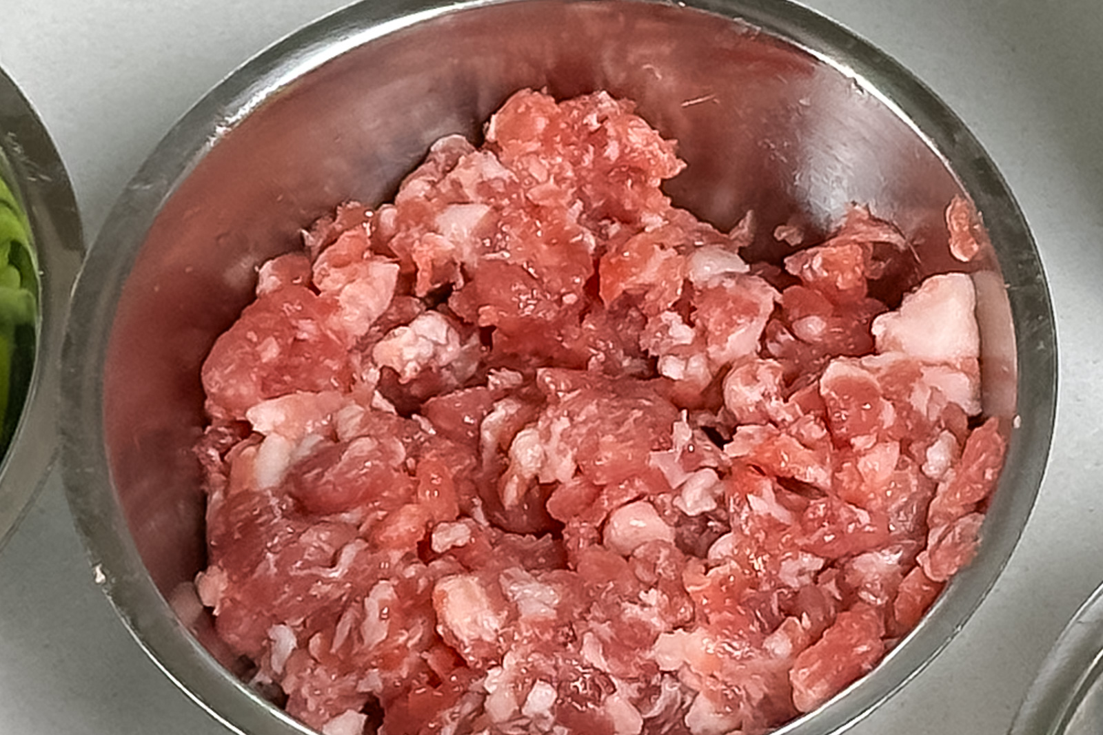 - Mal 300 g svinenakke grovt, eller hakk kjøttet godt og bland det med 1 ts fiskesaus.