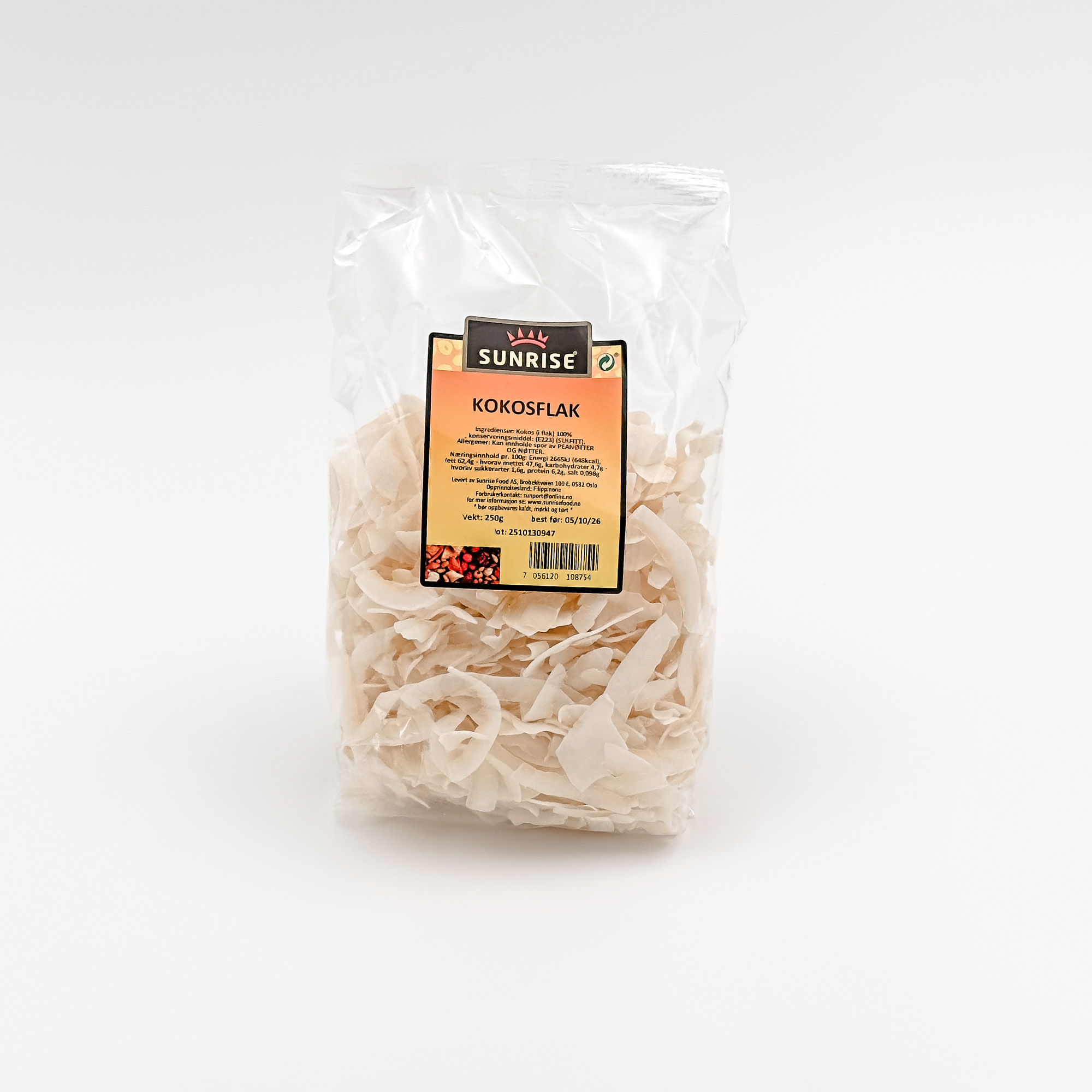Sprø, aromatiske kokosflak fra Sunrise. Perfekte til desserter, wokretter, salater og topping. Ristes lett for ekstra smak og tekstur.