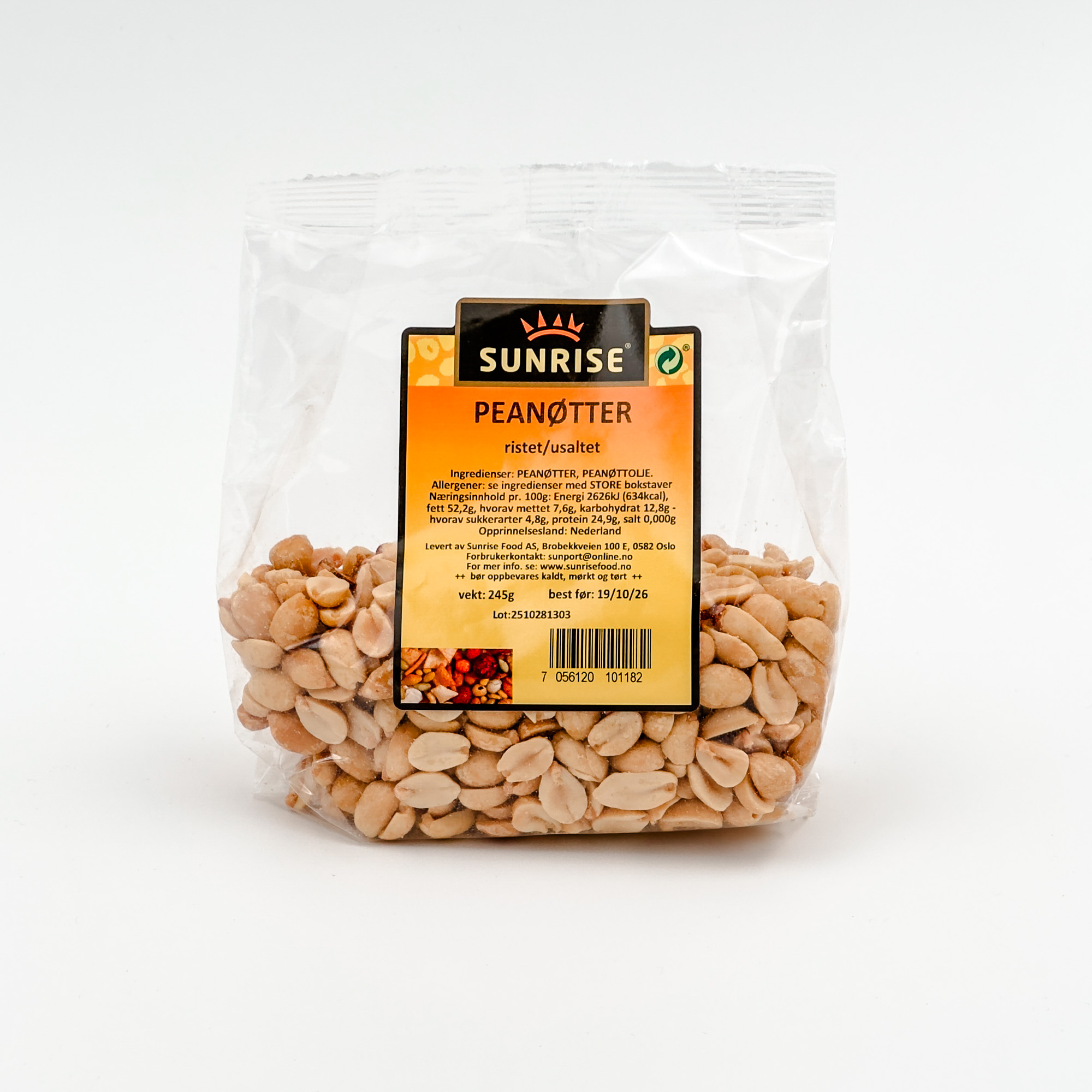 Ristede og usaltede peanøtter av høy kvalitet. Perfekt til thailandsk mat som satay, wok, curry og salater – gir nøttepreg, tekstur og fylde uten ekstra salt.