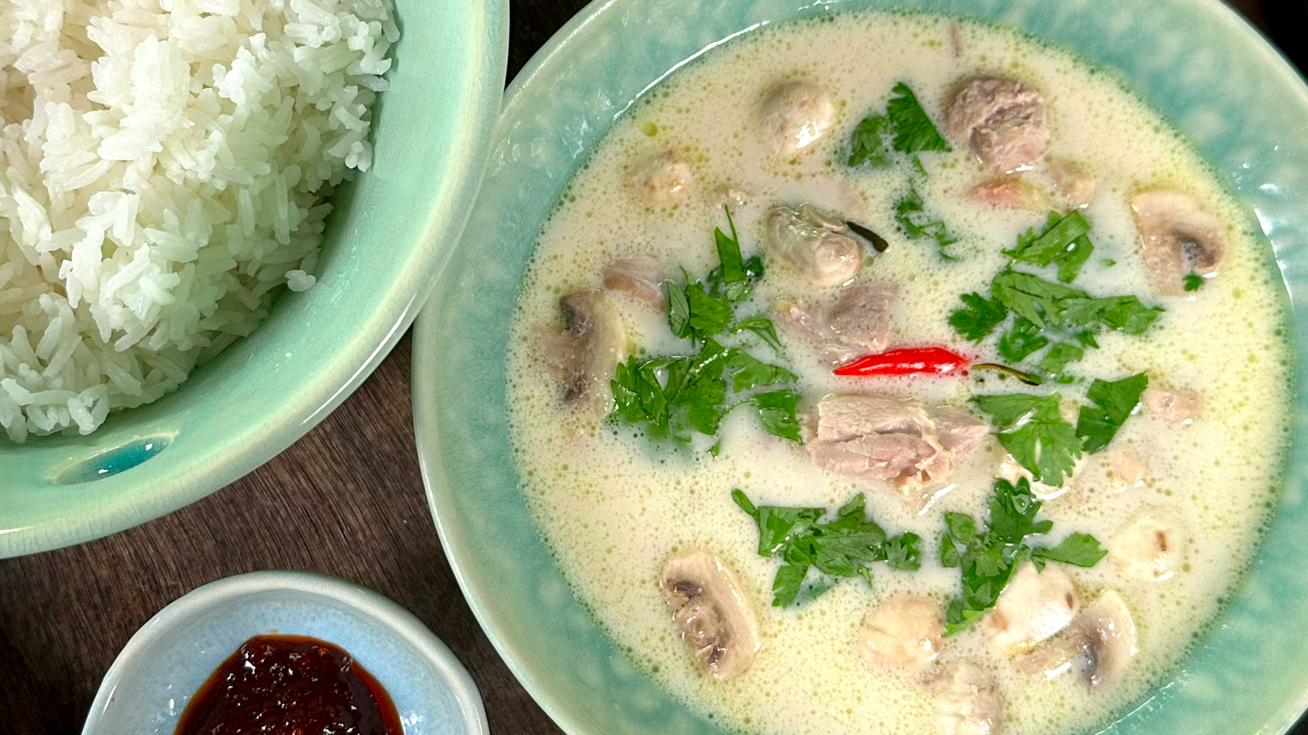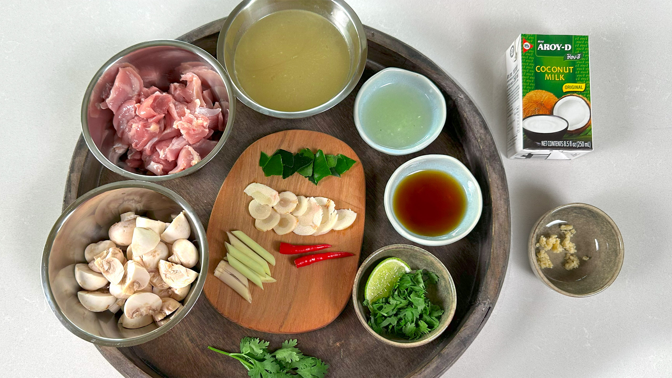 Her får du alle ingrediensene som definerer retten: galangal, sitrongress og limebader for friskhet og aroma, kombinert med kokosmelk, fiskesaus og palmesukker for dybde og balanse.