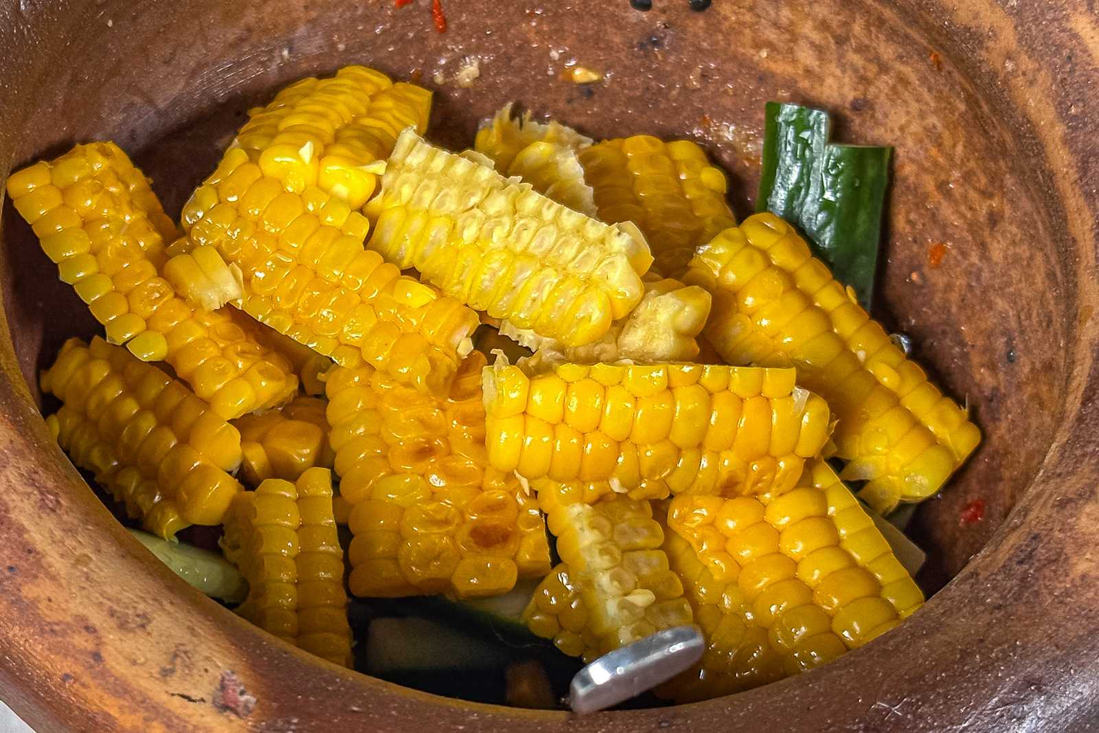 - Ha i mais og agurk i morteren og støt og vend godt med dressingen.